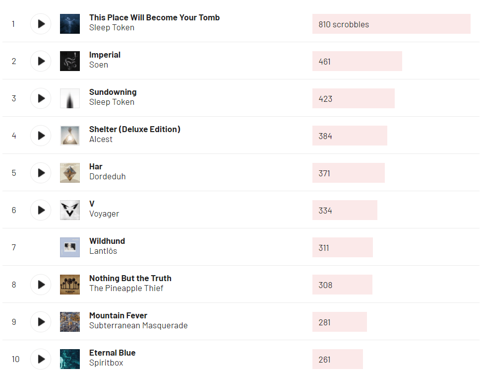 Interesant e ca Soen am ascultat practic tot anul, iar Sleep Token am descoperit doar in Noiembrie. Deci cum v-am zis mai sus, sunt un pic obsedat de Sleep Token, locurile 1 și 3 aparținând-i.